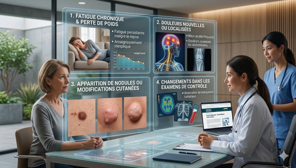 4 signes à surveiller après un cancer pour détecter une possible récidive. Après un traitement contre le cancer, certains signes cliniques peuvent indiquer une possible récidive. Bien qu’il n’existe pas de symptôme unique, une fatigue persistante et inexpliquée, qui ne s’améliore pas avec le repos, doit alerter. Des douleurs inhabituelles ou des symptômes similaires à